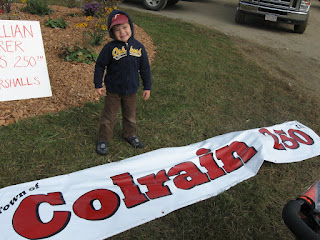 That same weekend, we were invited to walk in the 250th Town of Colrain parade. Our former neighbors (Haynes & Nancy) live there in an eco-village in Colrain now and they thought Kiefer would get a kick out being in a parade. He did! He was smiling and waving at everyone (although I'm pretty sure there were more people in the parade than were watching). His favorite part? The candy thrown from floats ahead of us. Of course. After the parade, we went back to Haynes & Nancy's house for lunch. They have turkeys, which both the kids got a kick out of. Kiefer fed them some cut up apples. Then, Haynes had Kiefer help him drive the tractor around. Needless to say, it was a great day for Kiefer!